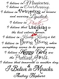 I believe in manicures I believe in overdressing I believe in primping at leisure and wearing lipstick I believe in Pink I believe that laughing is the best calorie burner I believe in kissing kissing a lot I believe in being strong when everything seems to be going wrong I believe happy girls are the prettiest girls I believe that tomorrow is another day I believe in Miracles Audrey Hepburn wall art wall sayings quote Details & Features