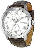 GUESS? W85043G2, Gents Dress Steel Series Watch. Stainless steel case. Brown leather strap. Quartz movement. Silver dial with roman indexes. Water resistant. (Read More)